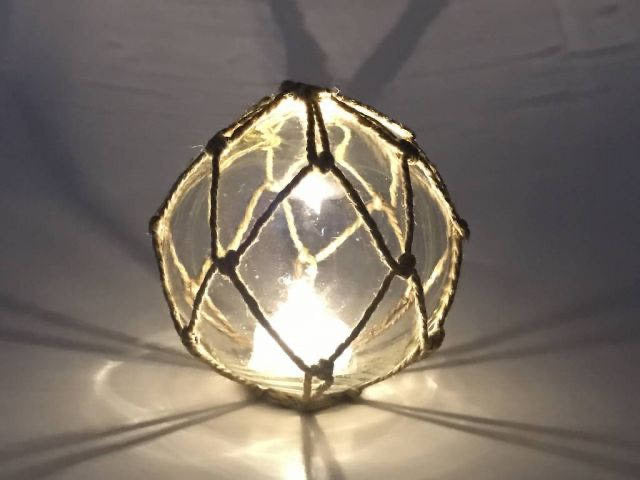 Clear Glass Lamp - Coastal Decor - Battery-Powered LED Lit Japanese Glass Ball Fishing Float with Brown Netting, 4"
