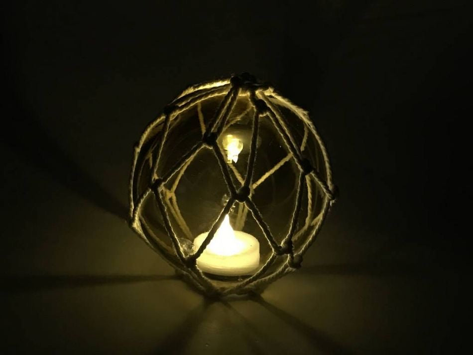 This 4” LED Lighting Japanese Glass Ball Fishing Float with Brown Netting Decoration is a perfect beach art decoration. Gorgeous weather in your home or office, indoor or out, enjoy the charming inner warmth of this glass float as the flameless LED tea light inside plays throughout the glass ball. Perfectly contrasting the glass float is the authentic fishing rope netting which holds the float in place. Mesmerizing and enchanting, enjoy the historic wonder and brilliant style of this LED-lit nautical glass float every day.
