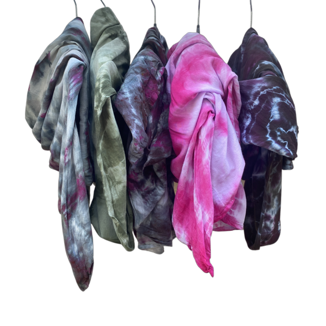 Every piece is dyed by hand in Bend, Oregon and is completely individual, just like the person wearing it. Each order comes packed in a hand-dyed reusable bag!